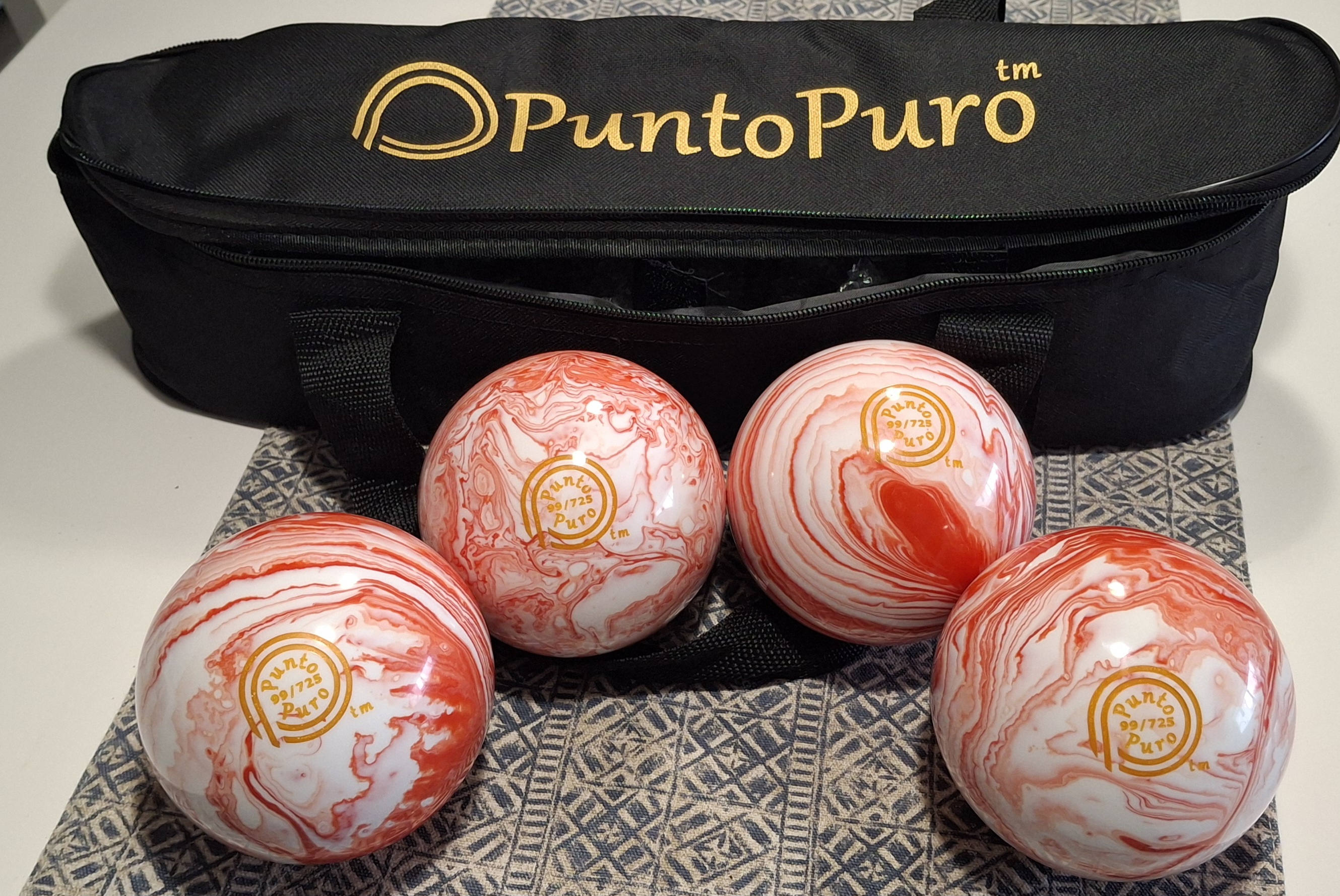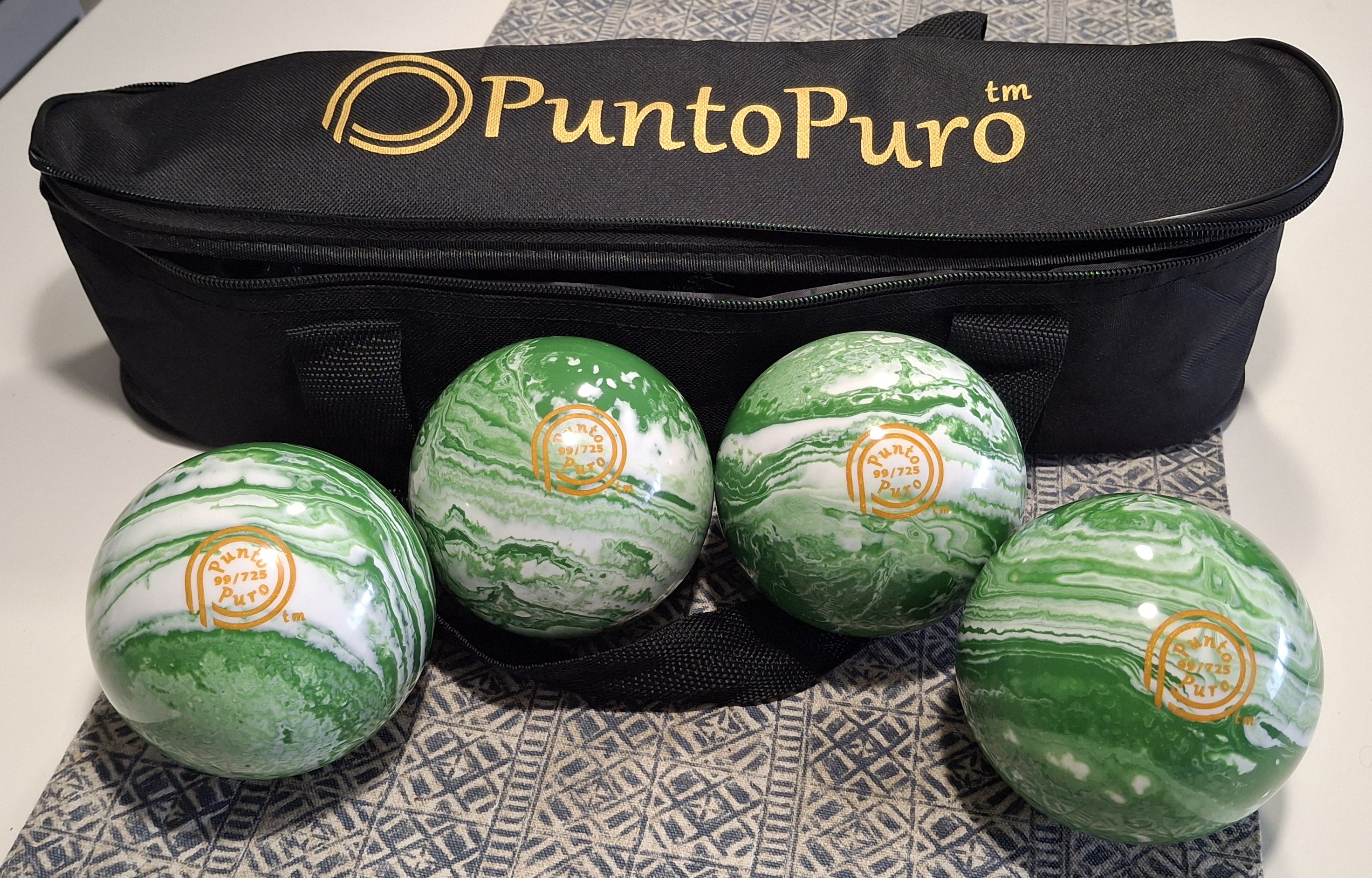 This set includes 4 marbleized bocce balls with your choice of green/white or red/white, along with a Punto Puro professional bag featuring a hard bottom and internal separators to protect the balls and reduce transport noise.